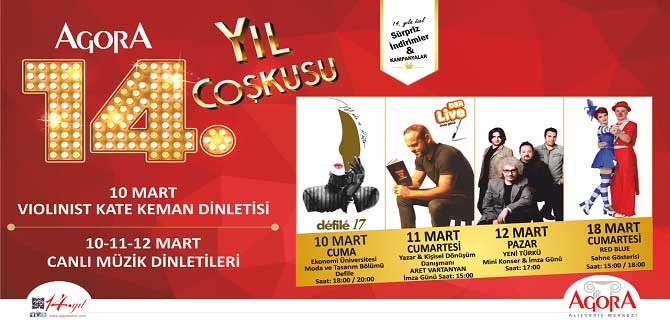 Perakende sektörünün yenilikçi ve önde gelen, İzmir’de kaliteli ve güler yüzlü hizmetin simgesi olan Agora Alışveriş Merkezi 14. yılını muhteşem etkinlikler ile kutluyor… Hizmete açıldığı günden bu yana İzmirlilerin sevgisi ile büyüyen Agora Alışveriş Merkezi, 14. yılında ziyaretçilerini birbirinden özel etkinlikler ve ünlü konuklar ile buluşturmaya hazırlanıyor.