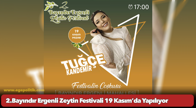 Bu sene ikinci kez düzenlenen Bayındır Ergenli Zeytin Festivali 19 Kasım Pazar günü Bayındır’ın Ergenli Mahallesi’nde gerçekleşecek.