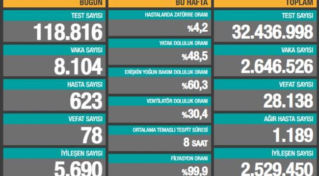 Bugüne kadar yapılan test sayısı 32 milyon 318 bin 182'ye ulaştı, vaka sayısı 2 milyon 638 bin 422, vefat sayısı 28 bin 60, ağır hasta sayısı 1185 oldu.