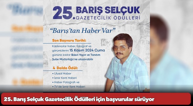İzmir Büyükşehir Belediyesi tarafından 25’incisi düzenlenen Barış Selçuk Gazetecilik Yarışması için başvurular devam ediyor. Barış Selçuk’un anısını yaşatmak ve genç gazetecileri teşvik etmek amacıyla düzenlenen Barış Selçuk Gazetecilik Ödülleri Yarışması’nda katılımcılar haber, fotoğraf ve görüntülerini, 15 Kasım 2024 Cuma gününe kadar İzmir Büyükşehir Belediyesi Basın Yayın ve Tanıtım Şube Müdürlüğü’ne ulaştırması gerekiyor.