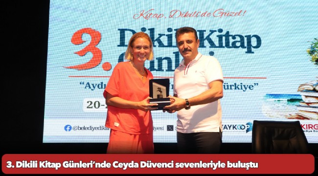Söyleşi sonrası plaket takdiminde bulunan Dikili Belediye Başkanı Adil Kırgöz “Sunuculuk, oyunculuk kariyerinin yanında toplumsal duyarlılığıyla da tanıdığımız sevgili Ceyda Düvenci’yi Dikili’de ağırlamaktan çok mutluluk duyduk. Bizleri kırmayıp burada olduğunuz için çok teşekkür ederim iyi ki varsınız” dedi.