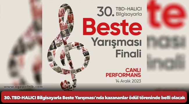 İzmir Büyükşehir Belediyesi, İZELMAN, Türkiye Bilişim Derneği, HALICI Bilgi İşlem işbirliğiyle düzenlenen Cumhuriyet’in 100’üncü yılı temalı 30. TBD-Halıcı Bilgisayarla Beste Yarışması’nın kazananları 14 Aralık Perşembe saat 20.00’de Ahmed Adnan Saygun Sanat Merkezi’nde (AASSM) düzenlenen törenle sahiplerini bulacak. İzmir Büyükşehir Belediye Başkanı Tunç Soyer’in de katılımıyla düzenlenecek ödül töreninde televizyon yapımcısı ve yönetmen İzzet Öz’ün sunumuyla finale kalan 10 eser dinlenecek ve 10 eserin sahibine ödülleri verilecek.