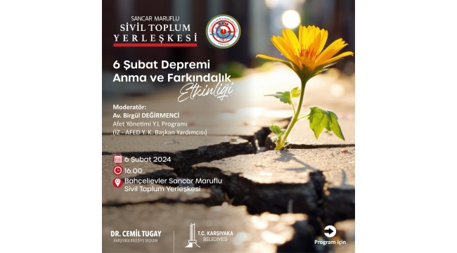 Karşıyaka Belediyesi Sancar Maruflu STK Yerleşkesinde 6 Şubat 2024 Salı günü Saat: 16.00'da başlayacak olup, Başkan Cemil TUGAY'ın da katılması bekleniyor. Kendisinin 6 Şubat depremlerinde bölgeye bir kaç kez giderek çalışmalara bizzat katıldığı biliniyor.