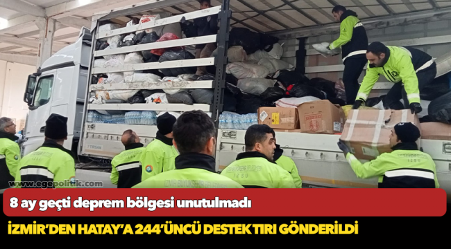 Kahramanmaraş merkezli depremlerin ardından tüm birimleriyle harekete geçen İzmir Büyükşehir Belediyesi, depremzedelere destek vermeye devam ediyor. Yurttaşların ve Büyükşehir Belediyesi’nin temin ettiği yardım malzemelerinin yer aldığı bir tır daha Hatay'a doğru yola çıktı. Tırda 300 soba, bin 200 hijyen paketi, 30 yatak, 492 battaniyenin yanı sıra 76 koli çocuk, 85 koli kadın, 34 koli erkek giyim malzemesi yer alıyor. 8 aydır her hafta bir yardım tırını bölgeye gönderen Büyükşehir Belediyesi, 244’üncü destek tırını yola çıkarmış oldu.