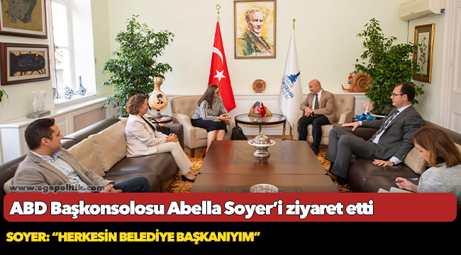 Amerika Birleşik Devletleri (ABD) Başkonsolosu Nancy Abella, İzmir Büyükşehir Belediye Başkanı Tunç Soyer’i makamında ziyaret etti. Ziyarette; ABD İzmir Fahri Konsolosu Güliz Balsarı, İzmir Büyükşehir Belediye Başkan Danışmanı Onur Eryüce, İzmir Büyükşehir Belediyesi Dış İlişkiler ve Turizm Dairesi Başkanı Gökçe Başkaya da yer aldı.
