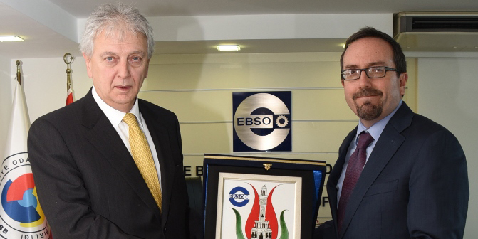EBSO Başkanı Yorgancılar, ziyaret anısına ABD Büyükelçesi Bass’a plaket verdi.