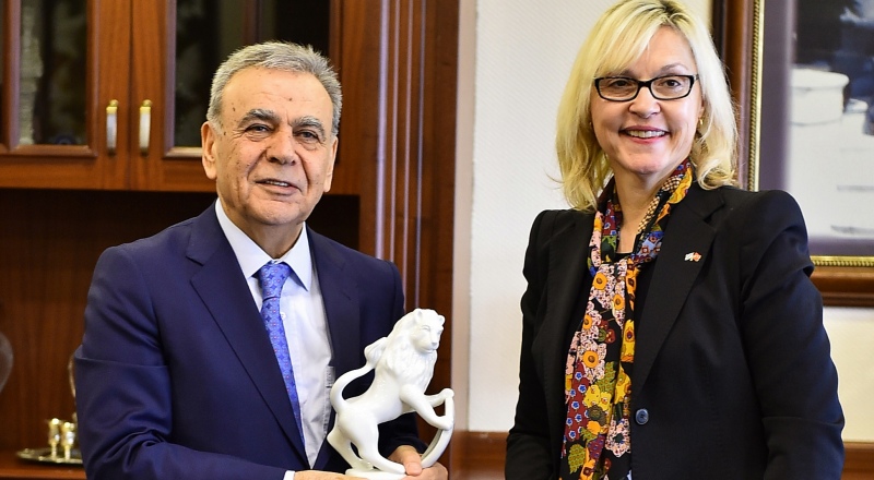Federal Almanya Cumhuriyeti Bavyera Eyaleti Avrupa ve Bölgesel İlişkilerden Sorumlu Bakanı Dr. Beate Merk ve beraberindeki heyet, İzmir Büyükşehir Belediye Başkanı Aziz Kocaoğlu’nu ziyaret etti. Mülteci sorunu ve mültecilerin durumu ile ilgili Ankara’da çeşitli temaslarda bulunduktan sonra İzmir’e gelen heyeti ağırlayan Başkan Aziz Kocaoğlu, Sultanahmet Meydanı’nda yaşanan bombalı saldırıda yaşamını yitiren Alman vatandaşları için Bakan Dr. Beate Merk’e başsağlığı dileğinde bulundu.