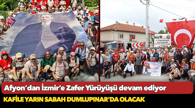 Büyük Taarruz’un 100’üncü yıl dönümünde ulusun bağımsızlık simgesi olan Afyon Kocatepe’den İzmir’e doğru yola çıkan İzmir Büyükşehir Belediyesi kafilesi, kurtuluş destanının tanığı topraklarda tarihi yolculuğunu sürdürüyor. Zafer yürüyüşünün üçüncü gününde 15 kilometrelik Çiğiltepe, Kırka, Akçaşar parkurunu aşarak Afyon etabının son noktası Yıldırım Kemal köyüne ulaşan kafile, bugün akşam saatlerinde Mustafa Kemal Paşa’nın “Ordular İlk Hedefiniz Akdeniz’dir, İleri” emriyle ulusun zaferini müjdelediği Zafertepe’ye ulaşacak. Kafile yarın sabah ise Dumlupınar’da düzenlenecek 30 Ağustos Zafer Bayramı törenlerine katılacak.