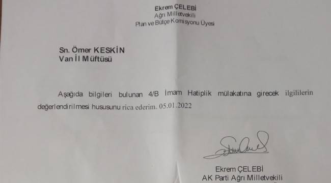 Sözcü'nün haberine göre AK Parti milletvekilleri Van Müftüsü’ne yazı göndererek yakınları için torpil ricasında bulundu. AK Parti Ağrı Milletvekili Ekrem Çelebi Van İl Müftülüsü Ömer Keskin’e, TBMM amblemi ve imzası bulunan 5 Ocak 2022 tarihli yazısında “Aşağıda bilgileri bulunan 4/B İmam Hatiplik mülakatına girecek ilgililerin değerlendirilmesi hususunu rica ederim” ifadesi yer aldı.
