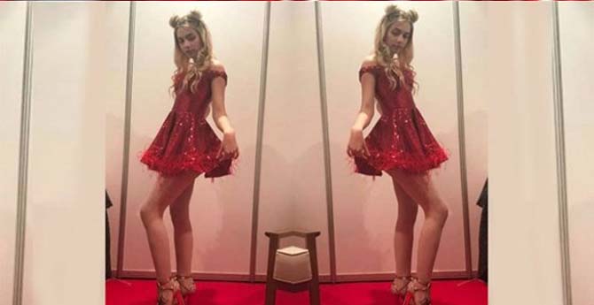 Kendisine özel dikilen kırmızı mini bir elbise giydi.