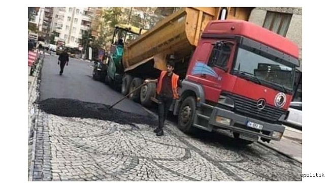 Sosyal medyada herhangi bir bozulma, çökme emaresi göstermeyen parke taş döşeli sokağa belediye ekiplerince zift döküldüğüne dair bir fotoğraf paylaşıldı.