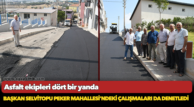 Karabağlar Belediyesi Fen İşleri Müdürlüğü ekipleri, ara vermeden sürdürdükleri asfaltlama çalışmaları kapsamında bu kez Peker Mahallesi'ndeydi. Peker Parkı yanında, yakıcı güneş altında çalışan ekipleri denetleyen Karabağlar Belediye Başkanı Muhittin Selvitopu, işçilere kolaylıklar diledi ve bölgedeki muhtarlarla, vatandaşlarla uzun süre sohbet etti.