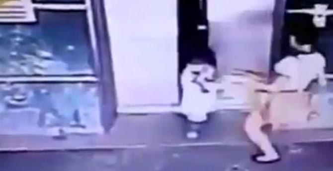 Çaresiz anne büyük bir soğukkanlılıkla kızına tekme atarak onu kapıdan uzaklaştırdı. Küçük kızın oldukça canı yansa da, anne büyük bir faciayı tekmeyle önledi.