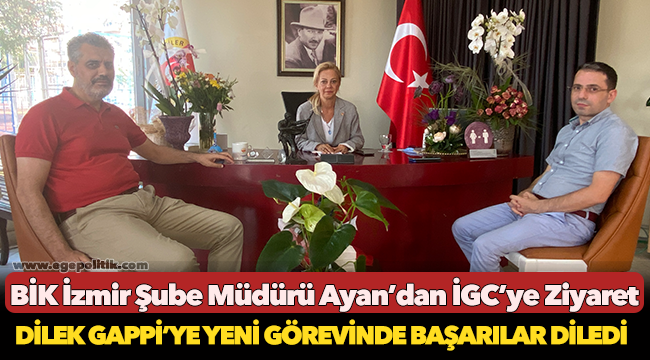 Basın İlan Kurumu İzmir Şube Müdürü Mehmet Feramuz Ayan ve Basın İlan Kurumu İzmir Şube Müdür Yardımcısı Ömer Serdar Çimen, İzmir Gazeteciler Cemiyeti Başkanı Dilek Gappi’ye tebrik ziyaretinde bulundu.