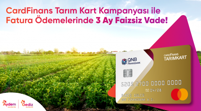 Gelirini tarımsal üretimden sağlayan ve çiftçilik belgesi sahibi tüm üreticiler, QNB Finansbank TarımKart’a sahip olarak elektrik fatura ödemelerinde hasat tarihine kadar vadelendirme şansı elde edecek. İlk üç ay için sıfır faiz uygulanacak iş birliğinde, Tarım Kart’ın ekstre tarihi, yetiştirilen ürünün hasat tarihine göre yılda bir veya yılda iki ödemeli olarak belirlenecek.