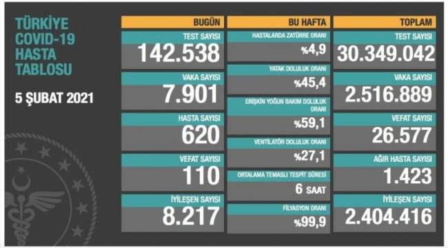 Sağlık Bakanlığı'nın açıkladığı günlük koronavirüs tablosuna göre, son 24 saatte ülkede Covid-19'dan 110 kişi yaşamını yitirdi, 7 bin 901 yeni vaka tespit edildi.