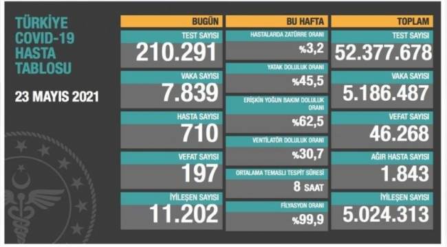 Tabloya göre Türkiye'de toplam vaka sayısı 5 milyon 186 bin 487'ye, toplam ölüm sayısı 46 bin 268'e yükseldi.