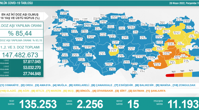 Sağlık Bakanlığı'nın yaptığı açıklamaya göre son 24 saat içinde ülke genelinde 2 bin 256 kişiye koronavirüs teşhisi konuldu, 15 kişiyse yaşamını yitirdi.