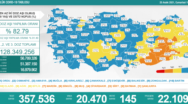 Bakanlık açıklamasına göre Türkiye'de son 24 saatte 357 bin 536 Covid-19 testi yapıldı, 20 bin 470 kişinin testi pozitif çıktı, 145 kişi yaşamını yitirdi.