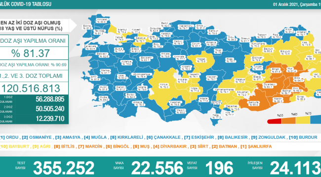 Sağlık Bakanlığı verilerine göre Türkiye'de son 24 saatte 355 bin 252 Covid-19 testi yapıldı, 22 bin 556 kişinin testi pozitif çıktı, 196 kişi yaşamını yitirdi.