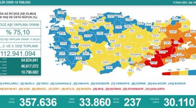 Bakanlığın açıkladığı verilere göre son 24 saatte 237 kişi yaşamını yitirdi, 33 bin 860 yeni vaka tespit edildi.