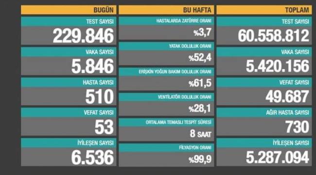 Sağlık Bakanlığı'nın günlük koronavirüs tablosuna göre, Türkiye'de son 24 saatte 53 kişi Covid-19 nedeniyle yaşamını yitirdi, 5 bin 846 yeni vaka tespit edildi.