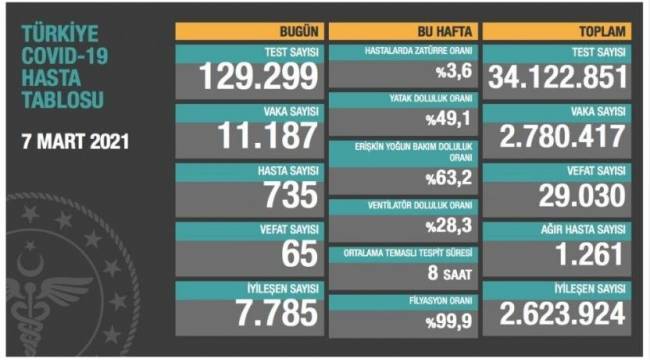 Tabloda yeni hasta sayısı 735, bugün iyileşen ve karantina süresi bitenlerin sayısı 7 bin 785 olarak yer aldı.