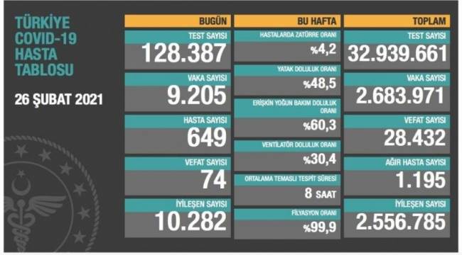 Sağlık Bakanlığı günlük koronavirüs tablosunu yayımladı. Buna göre son 24 saatte Türkiye'de 74 kişi daha koronavirüsten yaşamını yitirdi, 9 bin 205 yeni vaka tespit edildi.