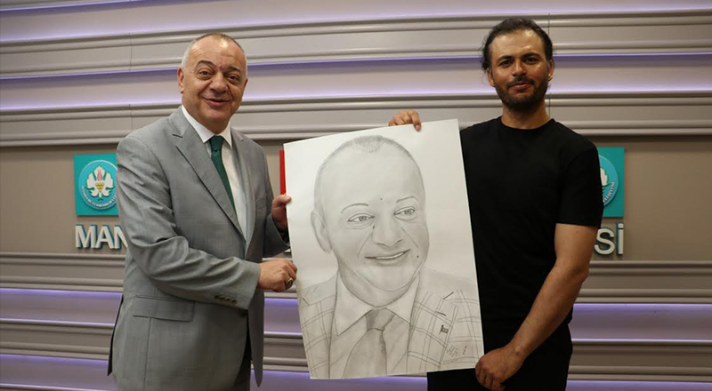 Manisa Büyükşehir Belediye Başkanı Cengiz Ergün’ün karakalemle portesini çizen Sanatçı Arif Ateş, Başkan Ergün’e hediyesini takdim etti. Manisa Büyükşehir Belediye Başkanı Cengiz Ergün’e olan sevgisini tuvale döken Kulalı Sanatçı Arif Ateş, Başkan Ergün’ü makamında ziyaret ederek hediyesini takdim etti. Sanatçı Arif Ateş, “Ben sizi çok seviyorum. Çalışmalarınızı yakından takip ediyorum. Manisa sizinle hem sanatsal hem de kültürel anlamda çok gelişti. Sizi görmek ve hediyemi sunmak için Kula’dan geldim” diye konuştu. Hediye için teşekkür eden Başkan Cengiz Ergün, “Elinize sağlık. Böyle özel bir hediye verdiğiniz için çok teşekkür ediyorum. Biz, Büyükşehir Belediyesi olarak sanata ve sanatçıya değer veren bir belediyeyiz. Bugün birçok belediyenin Şehir Tiyatrosu yokken bizim var ve çok da başarılı oyunlar sahneleniyor. Bütün ilçelerimizde sanatseverlerle buluşarak oyunlarını sergiliyorlar. Ben tekrar bu anlamlı hediye için teşekkür ediyorum. Sanat yaşamınızda başarılar dilerim” dedi.