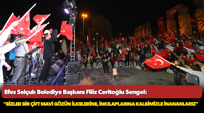 Konser öncesinde çocuklarla birlikte sahneye çıkan Efes Selçuk Belediye Başkanı Filiz Ceritoğlu Sengel, “Bizler bir çift mavi gözün ışığında adım atanlarız. Bizler bir çift mavi gözün ilkelerine, inkılaplarına kalbimizle inananlarız. Sonuna kadar da inanmaya devam edecek olanlarız. Cumhuriyetimizin kuruluşunun 99. yılını kutlarken; coşkuyla, şerefle daha özgür, daha eşit yarınlarda olacağız Efes Selçuk. Bunlar sizlerin sayesinde gerçekleşecek. Çocuklarıyla, gençleriyle, yetişkinleriyle, geleceğe güvenle bakan analarıyla hep birlikte bayrakları sallayalım. Cumhuriyetimizin 100. yılına gidiyoruz. Türkiye Cumhuriyeti’ni fabrika ayarlarına tekrar getirmeye gidiyoruz. Biz Mustafa Kemal Atatürk’ün ilkelerine, devrimlerine sonuna kadar inananlarız. Sonuna kadar da inanmaya devam edenleriz. Cumhuriyetimizin 99. yılı hepimize kutlu olsun” dedi.