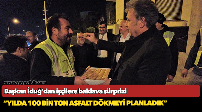 Gece yapılan çalışmalarda işçileri sık sık ziyaret ederek incelemeler yapan Başkan İduğ, çalışmaların son gününde de onların yanında oldu. İşçilere sürpriz yaparak baklava ikram eden Başkan Mustafa İduğ, hem çalışmaların tamamlanmasını hem de yeni yıllarını kutladı.