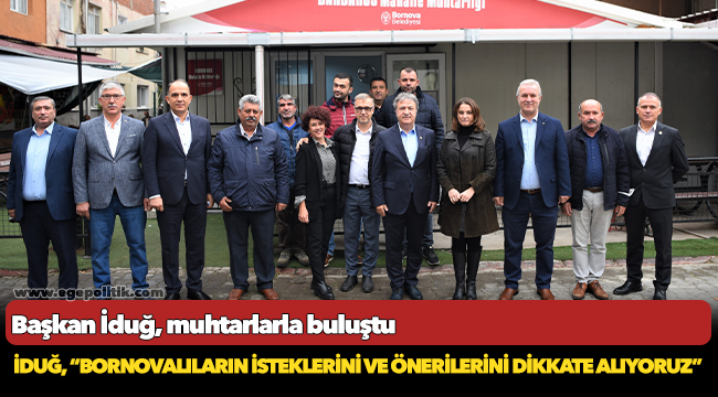 Bornova Muhtarlar Derneği’yle düzenli olarak toplantı yaptıklarını ifade eden Başkan İduğ, “Bornovalıların isteklerini ve önerilerini dikkate alıyoruz. Bu amaçla gerçekleştirdiğimiz toplantılarla mahallelerimizin sıkıntılarını, ihtiyaçlarını masaya yatırıyoruz. Onları dinliyor, yaptığımız çalışmaları anlatarak bizden isteklerini öğreniyoruz. Hayata geçirdiğimiz proje ve hizmetlerimizle ilgili muhtarlarımızın görüş ve önerilerini alıyoruz. Mahalli idarelerin temel taşı olan muhtarlarımız, bizlerin vatandaşa en yakın olan çalışma arkadaşlarıdır. Onların katkısı ve desteği bizler için çok önemli” dedi.