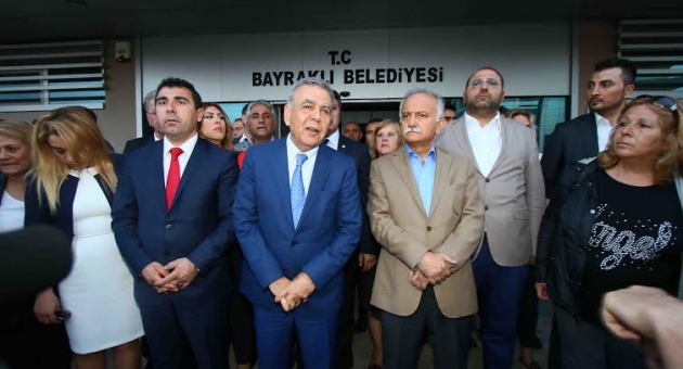 Bayraklı Belediye Başkanı Hasan Karabağ ise, “Aziz Başkanımızın bu ziyaretini mutlulukla karşıladım. Kendisine teşekkür ediyorum. Büyükşehir’e yapılan operasyonda da omuz omuza olmuştuk. Yine aynı şekilde omuz omuzayız. Görüşü alınmak üzere şuanda emniyette olan Gamze Eraslan arkadaşımızın son derece temiz bir arkadaşımız olduğunu hepiniz biliyorsunuz. Aslanlar gibi çıkacaktır. Yolumuza devam edeceğiz. Kimse bizi durduramaz. Böyle şeylerle siyaset yapılmaz. Siyasetin mecrası bu değildir. Siyaseti mecrasında yapmazsanız bir gün döner bumerang gibi sizi vurur. Keser ve sap dönecektir” diye konuştu.