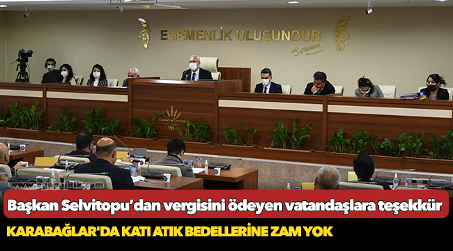 Karabağlar Belediye Meclisi'nin aralık ayı toplantısı, Karabağlar Belediye Başkanı Muhittin Selvitopu yönetiminde gerçekleştirildi. Ana hizmet binasındaki meclis salonunda yapılan toplantıya, CHP İlçe Başkanı Mehmet Türkbay'la Saadet Partisi İlçe Başkan Yardımcısı Mustafa Özkurt da katıldı.