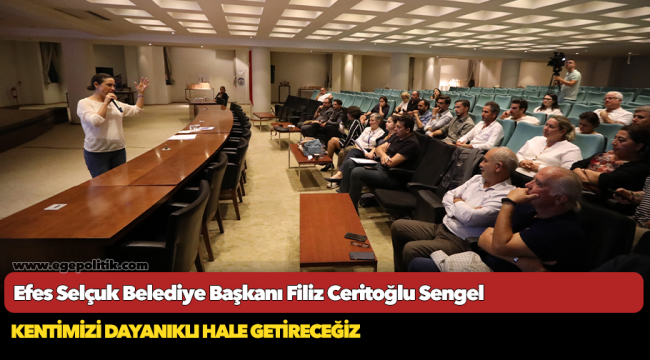 Toplantının açılış konuşmasını yapan Efes Selçuk Belediye Başkanı Filiz Ceritoğlu Sengel 17 Ağustos’ta düzenlenen Efes Selçuk Dayanıklı Kent Konferansı’nda Afet Masasından çıkan ilk başlıklardan birinin deprem olduğunu belirterek; “Mevzuyu afete hazırlık, afet sırası ve afetten sonrası olarak üç ana başlıkta inceleyeceksek biz şu an afete hazırlık noktasındayız. Aslında afetlere hazırlık noktasının yanı sıra afet sırasında da, afet sonrasında da birbirimize ihtiyacımız var. Bu kent bizim. Bu kenti afetlere karşı dayanıklı hale biz getireceğiz” dedi.