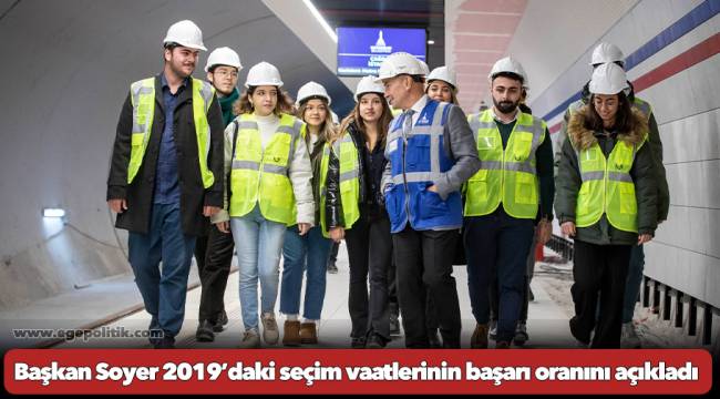 İzmir Büyükşehir Belediye Başkanı Tunç Soyer, 2019 yılındaki seçim beyannamesinde yer alan 165 projenin 144’ünü tamamlayarak yüzde 87 başarı oranına ulaştıklarını duyurdu. İzmir Büyükşehir Belediyesi’nin 2019-2023 yılları arasındaki projelerini içeren “Söz Verdik Yaptık” kitapçığı, Başkan Soyer’in İzmir’deki başarı karnesini gösteriyor. Kitapçığın içerisinde Soyer’in seçim vaatlerinde yer almayan fakat İzmir’in gelişen ihtiyaçlarına cevap vermek için Başkan Soyer döneminde hayata geçirilen 15 ek projeye dair bilgiler de bulunuyor.