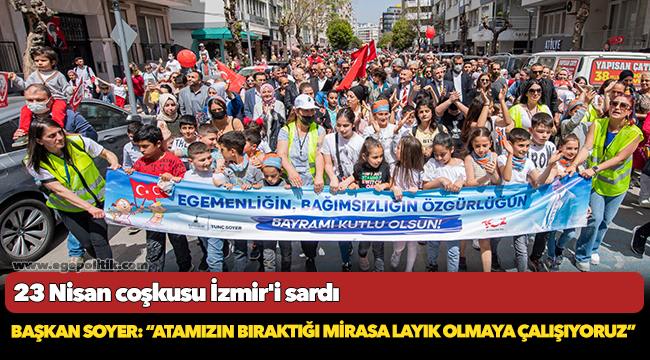 İzmir'de 23 Nisan Ulusal Egemenlik ve Çocuk Bayramı İzmir Büyükşehir Belediyesi'nin düzenlediği etkinliklerle şenlik havasında kutlanıyor. Gündoğdu Meydanı ile Kültürpark arasında düzenlenen korteje katılarak çocukların bayram coşkusuna ortak olan Soyer, “Atamızın bize bıraktığı mirasa layık olmaya çalışıyoruz. İzmir'de 23 Nisan Ulusal Egemenlik ve Çocuk Bayramı'nı neşeyle, coşkuyla kutluyoruz” dedi.