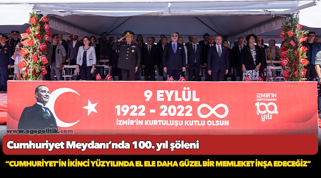 İzmir'in kurtuluşunun 100’üncü yıl kutlamaları büyük coşkuyla devam ediyor. Cumhuriyet Meydanı’nda düzenlenen törene katılan İzmir Büyükşehir Belediye Başkanı Tunç Soyer, “Her bir hücremize kadar İzmirli olmanın onurunu yaşadığımız 9 Eylül tarihi sadece bir şehrin kurtuluşu değildir. Aynı zamanda işgal edilmiş, kuşatılmış bir ülkenin hürriyetine ve bağımsızlığına kavuştuğu günün tarihidir. Bir milletin ayağa kalkışı ve Cumhuriyetimizin doğuşu, 100 yıl önce bugün gerçekleşti. Bu nedenle hep ‘İzmir, umudun yüzüdür’ diyorum” diye konuştu.