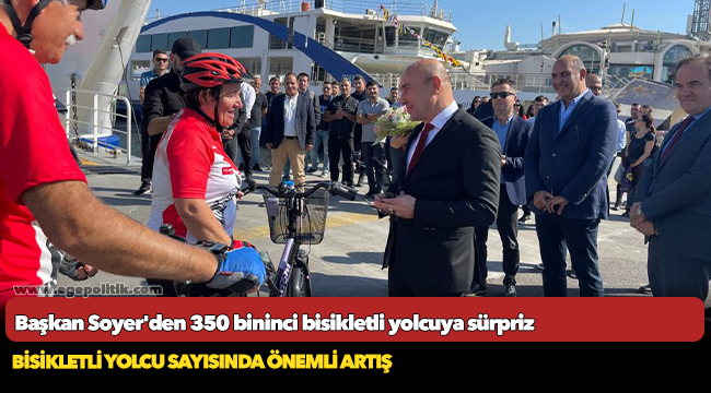İzmir Büyükşehir Belediye Başkanı Tunç Soyer, İZDENİZ vapurlarını kullanan 350 bininci bisikletli yolcuya plaket ve çiçek verdi. 350 bininci ve 350 bin birinci yolcu Basri Kunaç ile eşi Nermin Kunaç, Başkan Soyer'in sürprizinin kendilerini mutlu ettiğini söyledi.