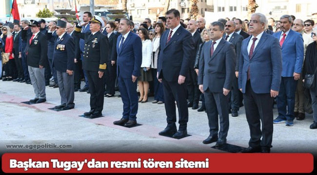 Tören, çelenk sunumu ile başladı. Daha sonra konuşan CHP İzmir Büyükşehir Belediye Başkan Adayı Dr. Cemil Tugay, 18 Mart'ın tarihi önemine dikkat çekti. Başkan Tugay, “Bundan 109 yıl önce 1. Dünya Savaşı'nın en kanlı, en acımasız ve en eşitlikten uzak savaşı 18 Mart Çanakkale Zaferi olarak tarihe yazıldı. Çökmekte olan bir imparatorluğun paylaşılması için son darbeyi vurmayı düşünenlerin ezberleri bozuldu. Kibirleri un ufak oldu. Bugünü anlamak, yarını tasarlamak, tarihi doğru okumakla mümkündür. 18 Mart bu ülkeye dair kaygı duyan, yarınına umut besleyen herkes için en önemli derslerden biridir. Bunu okumak, okutmak, öğrenmek ve öğretmek zorundayız. Bunu gerçeklerle ilgisi olmayan, hurafelerle gerçekleri çarpıtarak başaramayız. 18 Mart'ı doğru anlamak için 'Yurtta Barış Dünyada Barış' sözünü şiar ve duruş olarak kabul etmeliyiz” dedi.