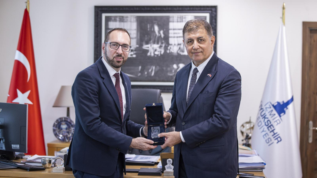 Dünyayı İzmir’de buluşturan İzmir Enternasyonal Fuarı için kente gelen konuk ülkelerin temsilcilerinin İzmir Büyükşehir Belediye Başkanı Dr. Cemil Tugay’a ziyaretleri sürüyor. Başkan Tugay, Belarus’un Ankara Büyükelçisi Anatoli Glaz ve sonrasında Hırvatistan’ın Zagreb Belediye Başkanı Tomislav Tomašević’i makamında ağırladı. Görüşmelerde karşılıklı ilişkiler gündeme geldi.