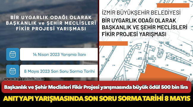 İzmir Büyükşehir Belediyesi’nin 30 Ekim İzmir depreminde hasar gördüğü için yıkılan ana hizmet binasının yerine inşa edilecek anıt yapı için açtığı fikir projesi yarışmasına başvurular sürüyor. “Bir Uygarlık Odağı Olarak Başkanlık ve Şehir Meclisleri Fikir Projesi” başlıklı yarışmada son soru sorma tarihi 8 Mayıs.