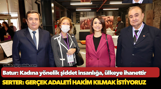 Çalıştayın açılış konuşmalarından ilkini gerçekleştiren İzmir Kadın Kuruluşları Birliği Başkanı ve Girişimci İş Kadınları Federasyonu Başkanı (GİFED) Huriye Serter, 21. yüzyılda halen kadına yönelik şiddetin, kısıtlamaların var olmasının, kadının toplum hayatındaki yerinin yok sayılmasının utanç kaynağı olduğunu vurguladı. Şiddet göstereni değil, şiddete uğrayanı koruyan gerçek adaleti hakim kılmak için mücadele ettiklerini dile getiren Serter, “Toplumsal cinsiyet uçurumunun giderek artması ve buna yasalarla da karşı koyamamamız şiddetin artmasındaki en büyük etken. Tecavüze uğrayan kız çocuklarının ruhsal bütünlüğünün zedelenip zedelenmediğini soruşturan, kadın katillerine haksız tahrik adı altında ceza indirimi sağlayan adaleti değil, gerçek adaleti hakim kılmak istiyoruz. Şiddete uğrayanların değil, şiddet uygulayanların utanç duymasını sağlamak zorundayız” dedi.