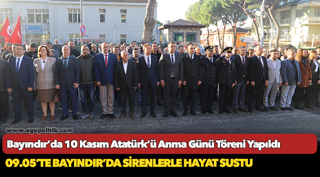 Türkiye Cumhuriyeti’nin Kurucusu Gazi Mustafa Kemal Atatürk’ün aramızdan ayrılışının 84.yılı olması dolayısıyla Bayındır’da anma töreni düzenlendi. Atatürk Anıtı önünde başlayan çelenk sunma merasiminin ardından saat 09.05’te Bayındır’da sirenlerle hayat sustu.