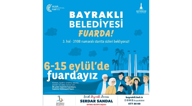 İzmir Fuarı 3 No'lu Hol’de vatandaşlarla bir araya gelecek olan Bayraklı Belediyesi, Kültür ve Sosyal İşler Müdürlüğü’nün hazırladığı aktivitelerle, yeni projelerin tanıtımları ve konuklarıyla bu yıl fuara damgasını vuracak. 150 metrekarelik 'Smyrna Kazı Alanı' tarihsel dekoru içinde konuklarını ağırlayacak olan Bayraklı Belediyesinin standı içinde, çocuk ziyaretçilerin ağırlanacağı bir bölüm de yer alacak. Gazeteci - Yazar ve sanatçı konuklar, Kültür ve Sosyal İşler Müdürlüğünün bünyesinde yer alan kurs programlarından Latin dansları, canlı müzik dinletisi, Hacivat-Karagöz, kukla yapımı gibi daha pek çok kültürel ve sanatsal etkinliklerle ziyaretçiler unutulmaz anlar yaşayacak. Bayraklı Belediyesi standı, dağıtılacak Türk bayrağı ve fuarın 88. yılına özel olarak hazırlanan çeşitli anı hediyeleriyle de vatandaşların uğrak yeri olacak.