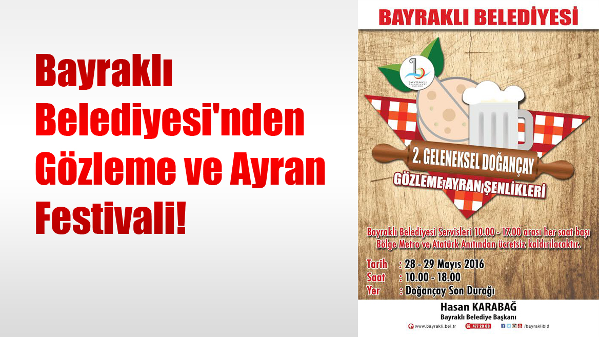 Bayraklı Belediyesi tarafından bu yıl ikincisi düzenlenen Doğançay Gözleme ve Ayran Festivali 28-29 Mayıs’ta gerçekleştirilecek. Festivalde ziyaretçiler, Doğançaylı annelerin el yapımı gözlemelerinden ve organik ayranlarından tadacak, kurulacak stantlarda doğal ürünler satılacak; ayrıca Kadın Kooperatifi üyesi kadınlar; el emeği, göz nuru ürünlerini sergileyecek.
