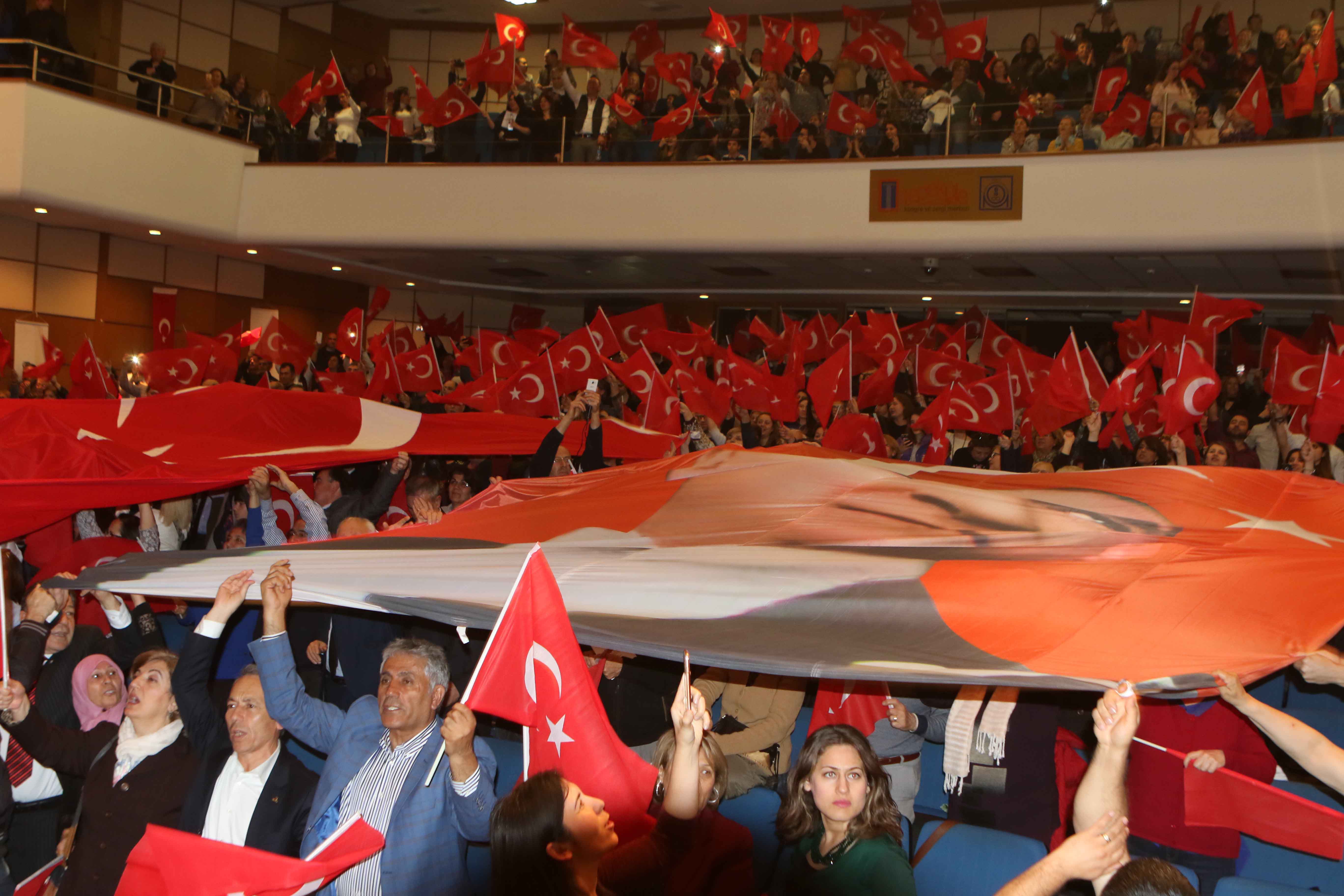 Belediye Başkanı Hasan Karabağ ise, “29 Ekim etkinliklerinden yola çıkarsak, o etkinlik sonrasında aldığımız mesajlar aslında bu ülkede laik Türkiye Cumhuriyeti'nin yaşatılması, korunması ve onun için mücadele edilmesi gerektiğini düşünen yüz binler, milyonlar olduğunu bir kez daha gösterdi. Ama bizim bir şeyimiz eksik. Yeterince organize değiliz. Atatürkçüler, yurtseverler, ilericiler, laikler, cumhuriyetçiler... Örgütlü bir şekilde hareket ettiğimizde cumhuriyetimizi Amerikan emperyalizmi güdümündeki şeriatçılara kaptırmayız. Topuyla, tüfeğiyle bizi yıkamayanlar kurtuluş savaşında, Çanakkale'de... Şimdi din eksenli siyasi organizasyonlarla ve ırkçı bir takım örgütlenmelerle bizi bölmeye çalışıyorlar. Bizim harekete geçmemiz lazım. Sessiz kalmayalım, boyun eğmeyelim. Cumhuriyeti yıktırmayalım. Bu cumhuriyet yıkılamaz. Bu ülkeyi böldürtmeyeceğiz. Bu ülkeyi çocuk tecavüzcülerine, sapıklara ve İslam’ı sapkınlıklar noktasına çekenlere ve o amaçla bizleri yıkmaya çalışanlara asla izin vermeyelim. Bayraklı'dan İzmir'den yola çıktık. İnşallah ülkeyi bu karanlıktan çıkaracağız. Ne mutlu laikim diyene, ne mutlu cumhuriyetçiyim diyene, ne mutlu Atatürkçüyüm diyene, ne mutlu Türkiyeliyim diyene” diye konuştu. Salonu dolduran vatandaşlar daha sonra elerindeki Türk Bayraklarını sallayarak, hep bir ağızdan İzmir ve 10’uncu yıl marşlarını coşkuyla söyledi.