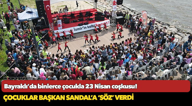 Bayraklı Belediye Başkanı Serdar Sandal “Çocuklar bizim geleceğimiz. 23 Nisan 1920’de egemenlik kayıtsız ve şartsız millete verildi. Ağanın, paşanın milleti yönettiği değil; milletin kendi iradesiyle yönetime el attığı gündür bugün. Ulu Önder Mustafa Kemal Atatürk, egemenliğimizi çocuklara armağan etti çünkü çocuklarımız ülkemizin, geleceğimizin ve cumhuriyetimizin de teminatıdır. Çağdaş, uygar dünyaya inanan vatandaşlar olarak geleceğimiz, çocuklarımız, gençlerimiz için daha aydınlık yarınlar günler yaratacağız. Kimsenin kimseden farkı yok. İnancından, siyasal kimliği veya görüşünden dolayı hiçbirimizin birbirinden bir üstünlüğü yok. Bu ülkenin bağımsızlığından, bölünmezliğinden, bayrağımızdan ve Atatürk ilkelerinden asla geri adım atmayacağız. Bunun için söz veriyor musunuz” dedi. Çocuklar da hep bir ağızdan ‘söz’ diye yanıt verdi.