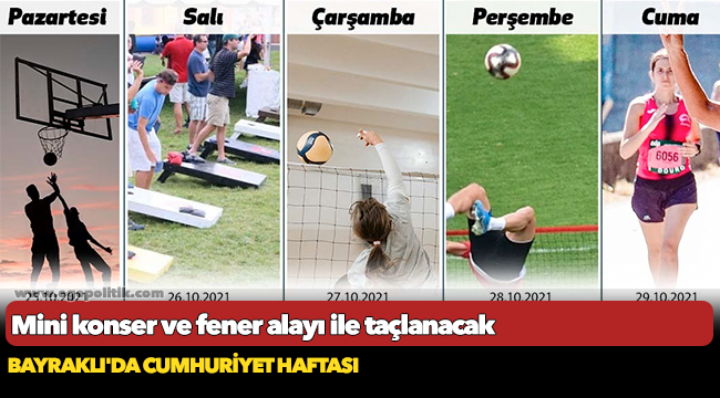 Bayraklı Belediyesi, 29 Ekim Cumhuriyet Bayramı dolayısıyla etkinlik programı hazırladı. 7'den 70'e yüzlerce ilçe sakinini bir araya getirecek aktivitelerde sporcular çeşitli turnuvalarda karşı karşıya gelecek. 29 Ekim Cuma günü ise saat 18:30'da Cengizhan Mahallesi'ndeki Ekrem Akurgal Yaşam Parkı'ndan Şehit Ümit Boz Spor Tesisi'ne kadar vatandaşların da katılımıyla kortej eşliğinde fener alayı yürüyüşü yapacak. 19:23'te tesiste başlayacak etkinlikte Bayraklı Belediyesi sporcuları ve zeybek ekibi gösteriler sunacak. Cumhuriyet Bayramı etkinlikleri Kayra Müzik konseriyle sona erecek.