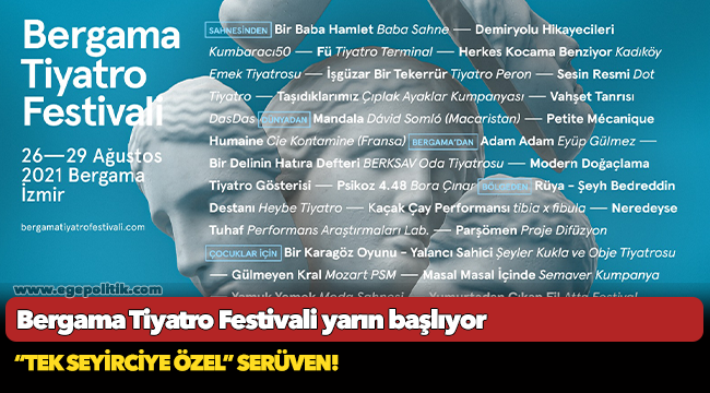 T.C. Kültür ve Turizm Bakanlığı’nın katkıları ve İzmir Büyükşehir Belediyesi, Bergama Belediyesi, Bergama Kültür ve Sanat Vakfı (BERKSAV), Bergama Ticaret Odası (BERTO) ve Ne Yerde Ne Gökte Derneği’nin destekleriyle BERaBER ve 3dots tarafından düzenlenen Bergama Tiyatro Festivali yarın başlıyor. Üç senelik aranın ardından bu yıl ikincisi düzenlenen festivalde ulusal ve uluslararası 25 oyun sahnelenecek. Ulusal ve uluslararası toplulukları sanatseverlerle buluşturacak festival yarın (26 Ağustos) başlayacak ve 29 Ağustos’ta sona erecek.